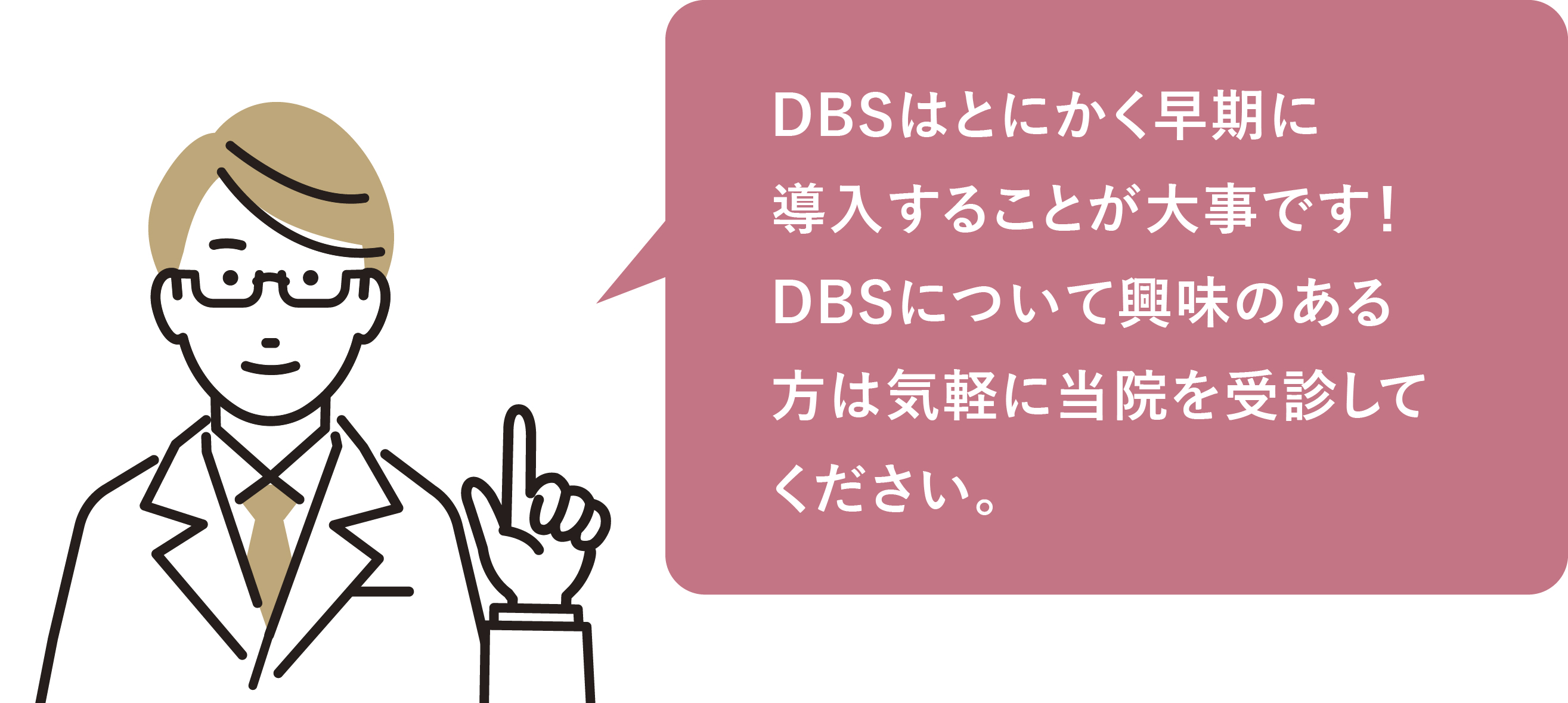 病気が発症して10年以内、オフやジスキネジアの出現で困り始めた時期ぐらいにDBSを導入すると効果的です。